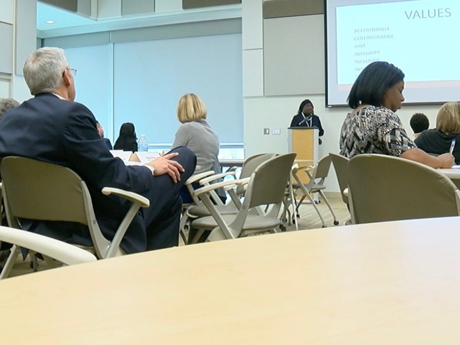 Karen Bankston addresses the Child Poverty Collaborative steering committee on Feb. 6, 2018. (Ramsay Fulbright | WCPO)