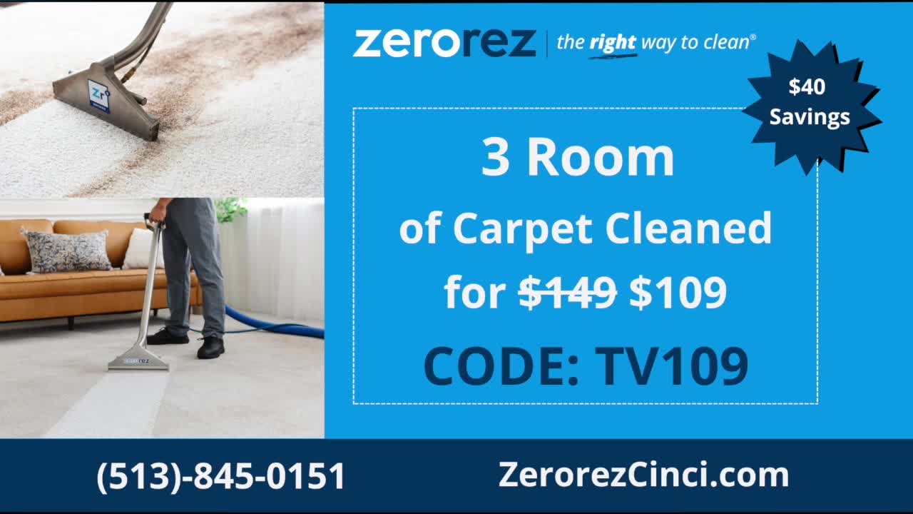 For a limited time, get 3 rooms of carpet cleaned for $109 with promo code TV109. Call (513) 845-0151 or visit zerorezcinci.com to schedule.