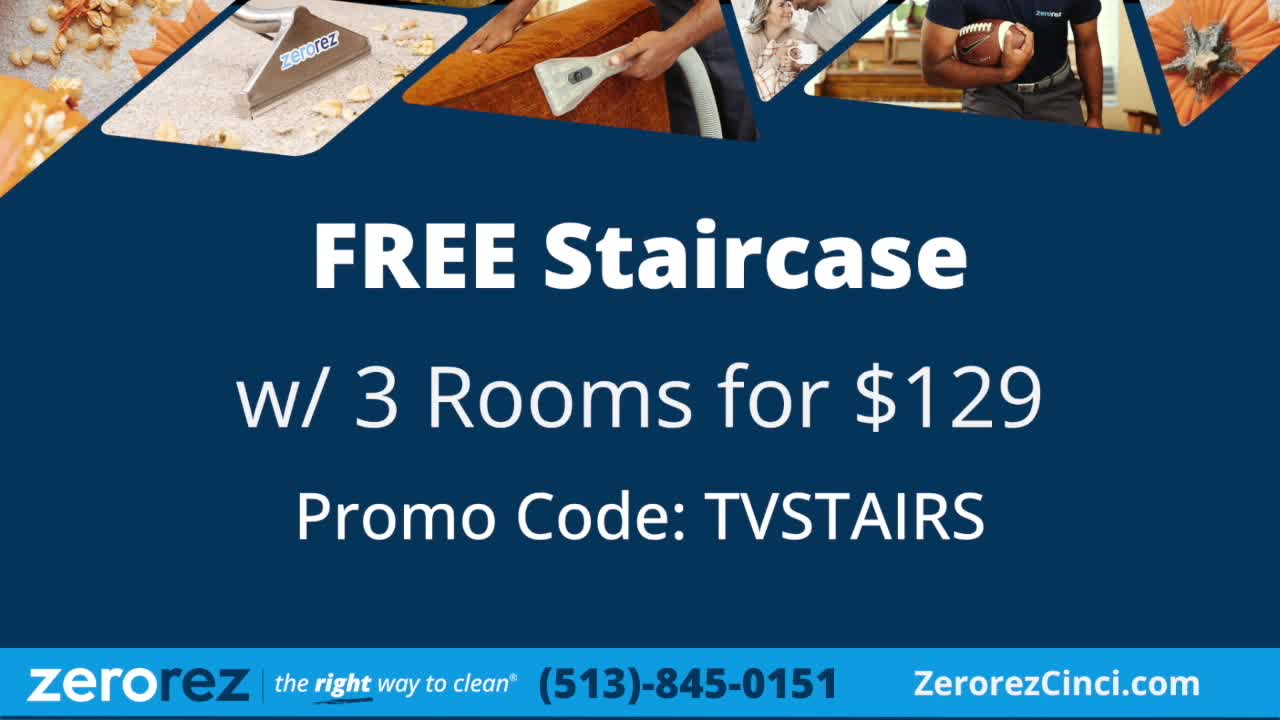 Holiday guests are coming, so make sure your home is ready with Zerorez Cincinnati! Their eco-friendly, high-alkaline water cleans carpets without harsh soaps or residue. Today only, get a free staircase cleaning with three rooms of carpet for $129 using promo code TVSTAIRS. Call 513-845-0151 or visit zerorezcinci.com to book.