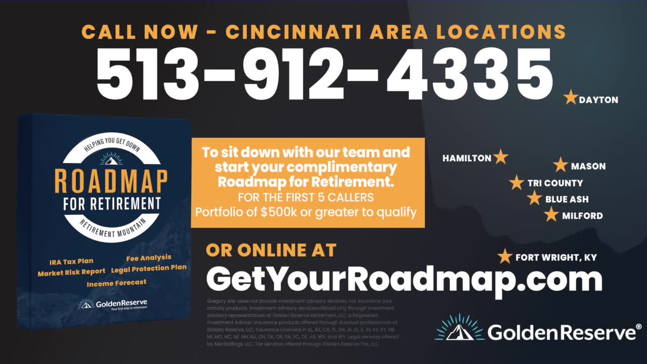 If you have a portfolio of $500,000 or greater, Golden Reserve is offering a complimentary Roadmap for Retirement with no charge or obligation. Call 513-912-4335 or visit www.GetYourRoadmap.com to schedule today.