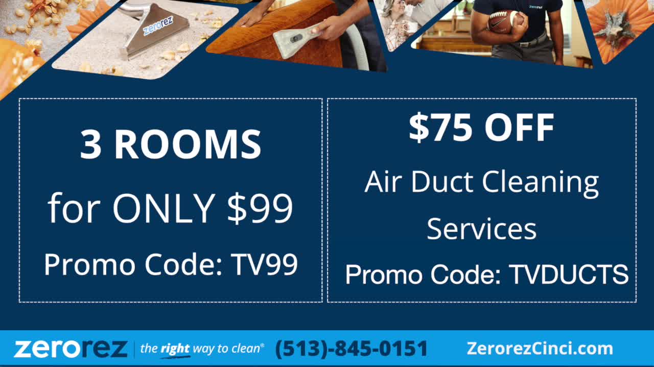 Cleaner air starts with cleaner ducts, and Zerorez Cinci is here to help. Air in your home circulates through your ductwork several times a day, especially in winter, and Zerorez Cinci can remove dust, debris, pet toys and more. Use promo code TVDUCTS for $75 off air duct cleaning or TV99 for 3 rooms of carpet cleaning for $99. Call 513-845-0151 or visit ZerorezCinci.com to schedule.