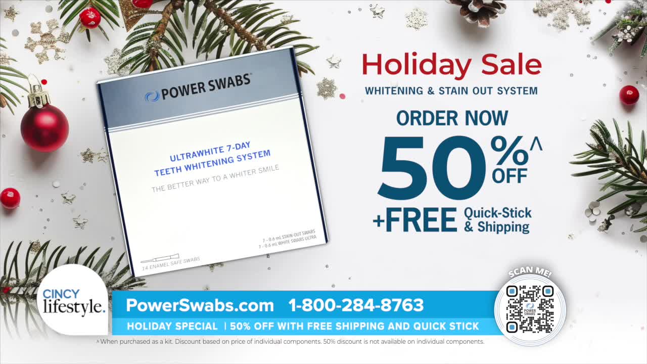 Get your smile holiday ready in less than five minutes a day. With power swabs, you can see up to two shades whiter after the first use and up to six shades whiter over seven days. Right now, you can save 50%, get free shipping, and receive the daily quick stick for stain removal on the go. Order today at powerswabs.com and follow along on Facebook at facebook.com/powerswabsmile and Instagram at instagram.com/powerswabs