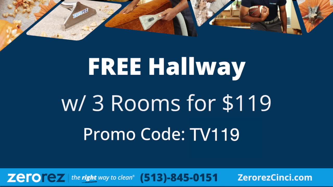 You can receive 3 rooms of carpet cleaned for $119 plus a free hallway. To schedule, visit www.zerorezcinci.com or call 513-845-0151 and use TV promo code TV119.