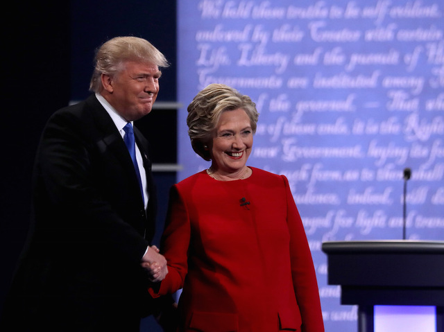 Democratic presidential nominee Hillary Clinton takes the stage with Republican presidential nominee Donald Trump during the Presidential Debate at Hofstra University on September 26, 2016 in Hempstead, New York. The first of four debates for the 2016 Election, three Presidential and one Vice Presidential, is moderated by NBC's Lester Holt.