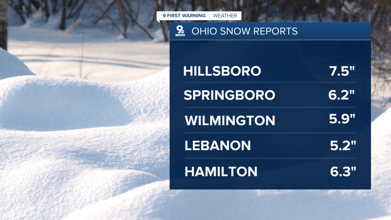 Some of the highest totals, as expected, came from cities north of Cincinnati. One of the snow winners for our area was an impressive 7.5 inches in Hillsboro. Most of southwest Ohio saw 4 to 6.5 inches.