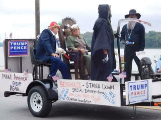 Four people dressed in costume played the roles of Trump, Clinton, The Grim Reaper and a clergyman (from "The Exorcist?). The float bore Trump-Pence campaign signs and a few handwritten pro-Trump, anti-Clinton messages. One repeated the Trump mantra, "Make America Great Again" and a larger one said "Benghazi – Stand Down."