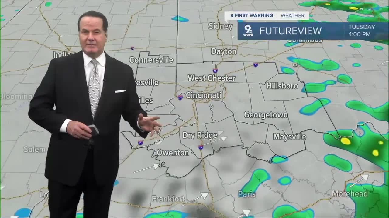 Clouds are thickening up across the area as a weak cold front moves in. This front will bring a wide area of rain that spreads over southwest Ohio through the night. Most places will see just plain rain, but temperatures in central Ohio will get close to freezing. So, if you're traveling to Columbus, a few spots could see a quick mix of rain and snow early in the morning, mainly around daybreak.