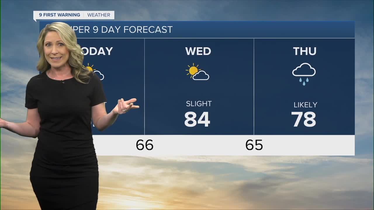 Wednesday is another warm and breezy day. Temperatures are expected to rise to 84 degrees with a mostly cloudy sky. Again, there's a tiny rain chance but the majority of the day should be dry. The main rain chance is around 3 to 7 p.m., but again, it's quick and isolated.