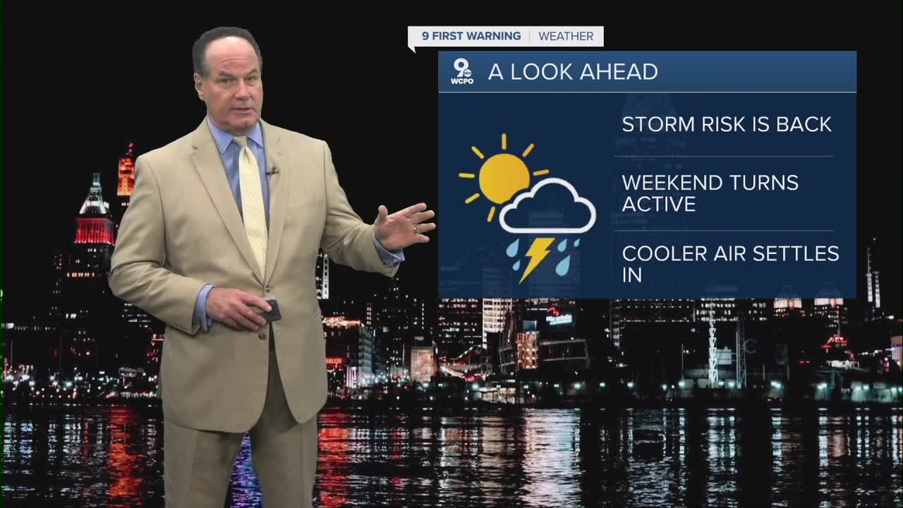 Friday briefly quiets down with mostly sunny skies and highs back near 80 degrees. Friday night is quiet before a chance for showers to develop overnight as morning lows start warm in the low to mid 60s again.