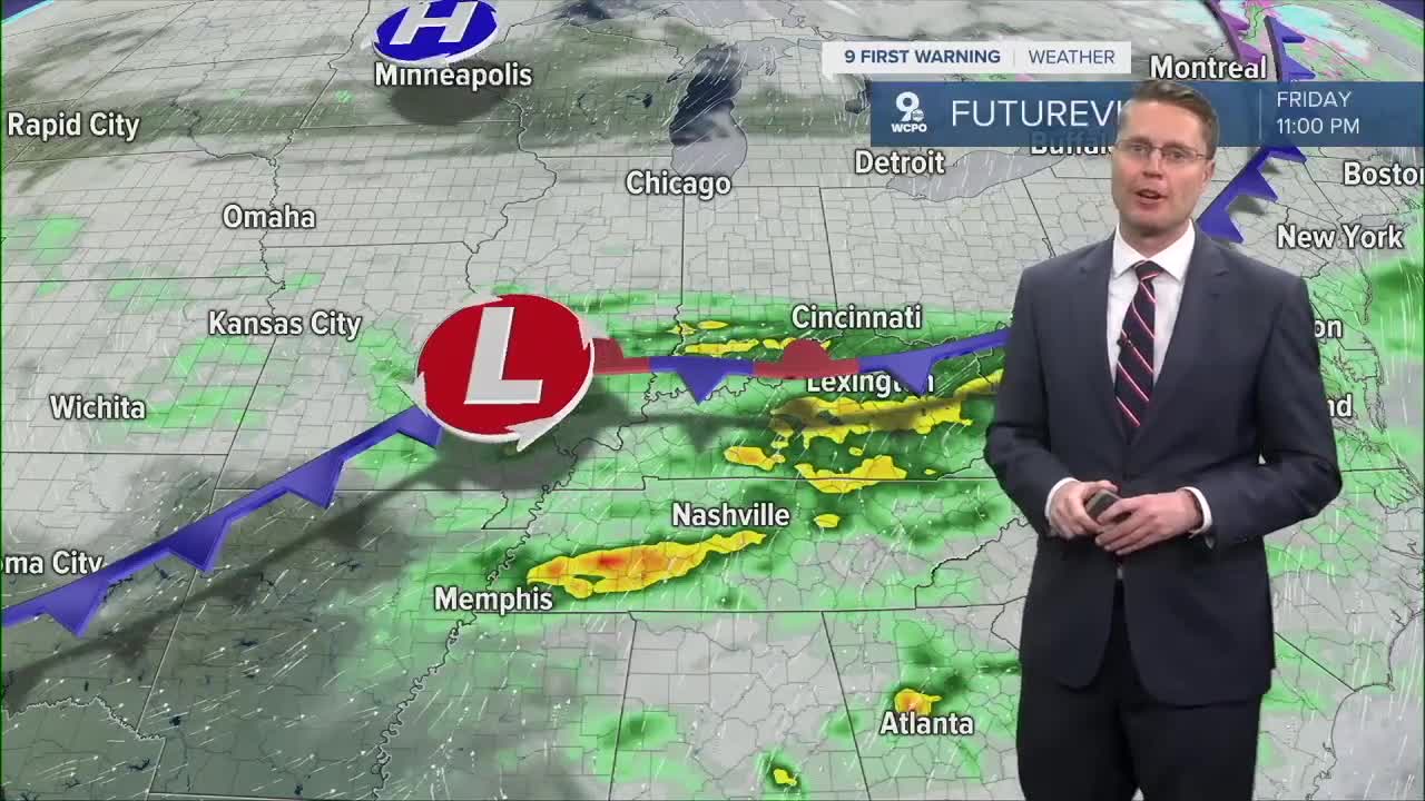 A warm front will start to slide towards the region on Thursday, helping to keep us mostly cloudy for another day. It could trigger a couple of spotty showers across Kentucky in the afternoon, but they likely stay south of our area. Highs will be in the upper 50s.