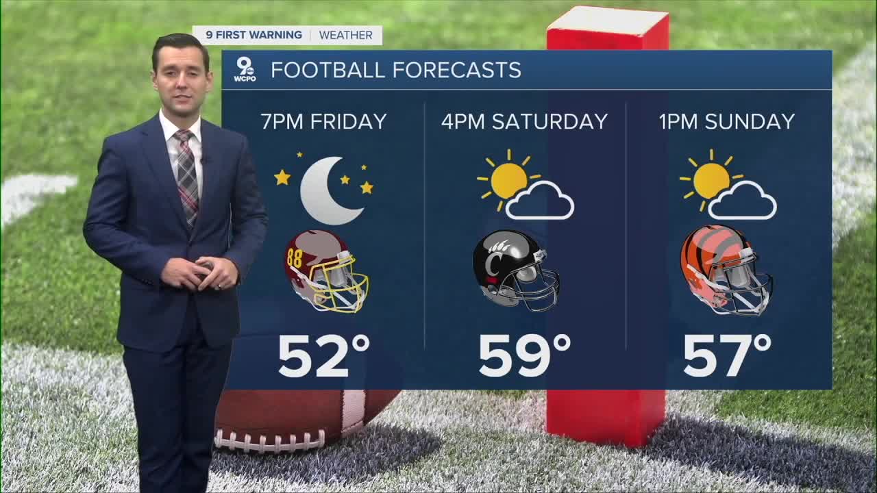 Clouds are back for the weekend forecast. Highs will be around 60 degrees on both days. While there's still a very small chance for rain later Sunday, the Bengals game still looks dry in the early afternoon hours.