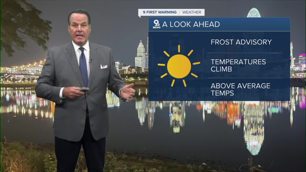 The sky stays mostly clear, and this is going to allow the temperature to drop into the upper 30s for most neighborhoods. North of Cincinnati, the temps will fall a bit more, ranging from 34-37 degrees. This is where we will see some isolated reports of frost. A FROST ADVISORY has been issued ( check out the map below ).