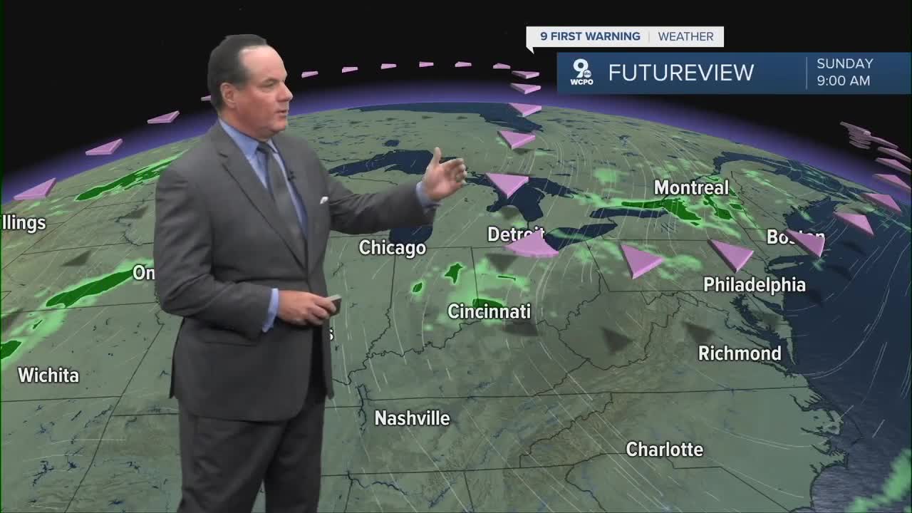 As the wind turns more southerly, the flow will bring in warmer air, and afternoon highs will climb into the mid-to-upper 80s by Sunday. This means the Bengals' home opener will feel quite warm, more like late summer than early fall. However, if you are up around daybreak through about 9 am, there's a slight 20% chance for a passing shower from a disturbance that will be out of here well before kick-off.