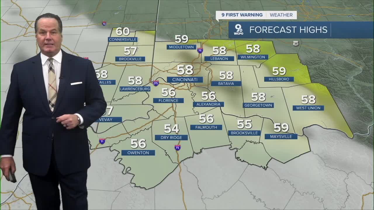 Tuesday Morning lows will drop to the upper 40s as most communities see simply clouds throughout the day. Afternoon highs reach into the upper 50s for most. But at night, rain will develop.