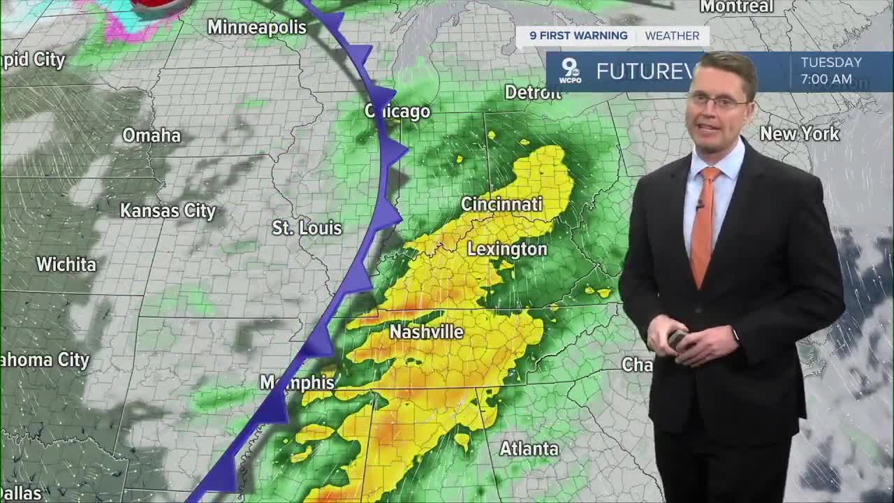 The clouds will thicken up through Monday. At the earliest, a few spotty light showers could pop up in the afternoon, but a lot of the Tri-State has a good chance of being dry into the evening commute. Highs will be in the mid 50s.