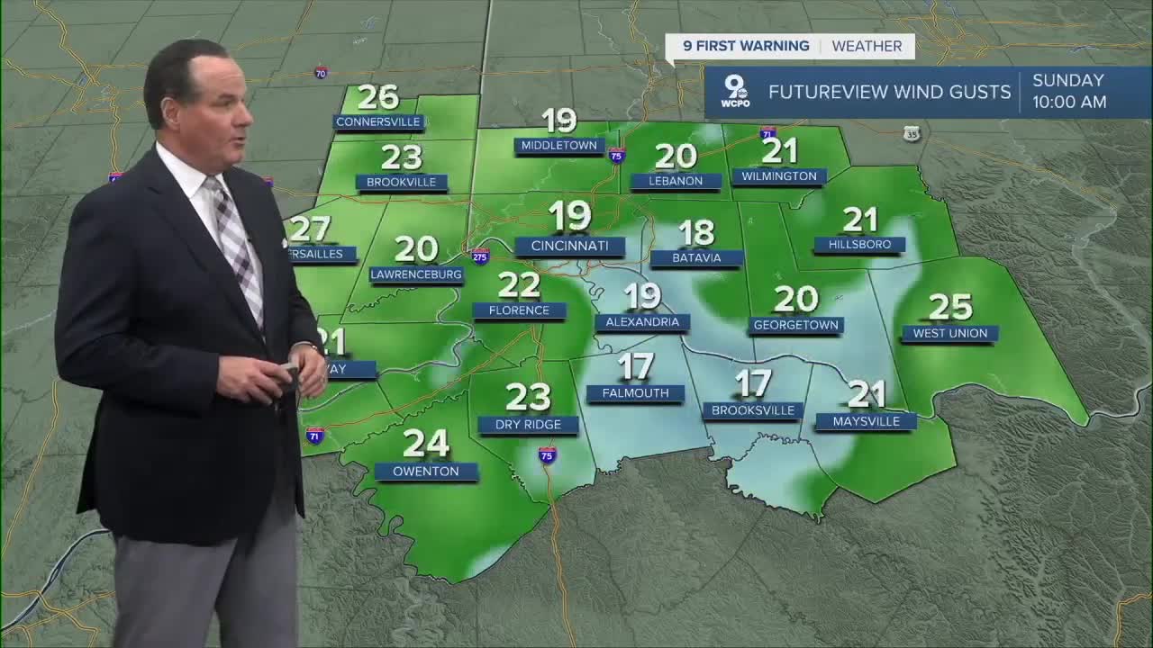 The Sunday forecast is what we call a backward temperature day. The warmest air, highs in the mid-60s, happens in the overnight hours. Temperatures cool during the day. By Sunday afternoon, temperatures will be cooling into the mid to low 50s. Sunday is also going to be a windy day with winds from the southwest at 20 to 30 mph, gusting to 40 mph. And we aren't done with rain. We'll continue to see spotty showers into the afternoon timeframe as well.