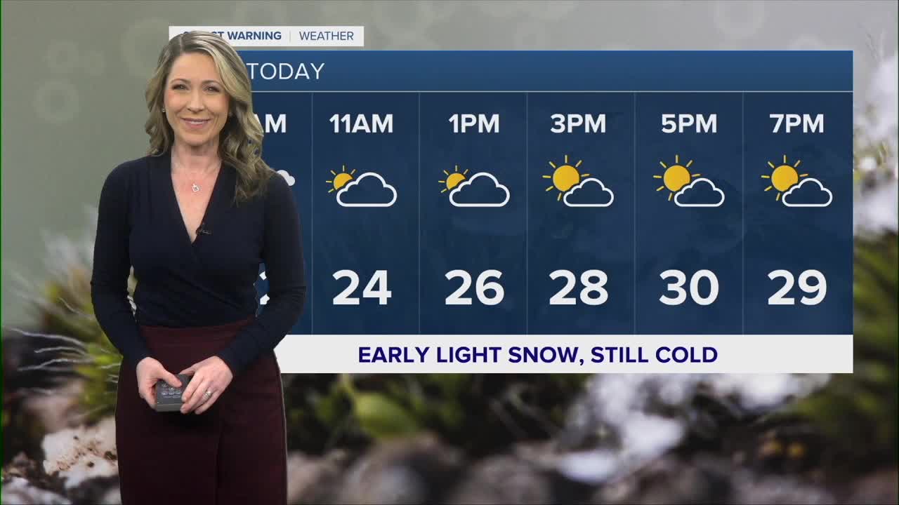 The sky will be mostly cloudy throughout the morning hours and it turns partly cloudy this afternoon. High temperatures only warm to 30 degrees and wind chills will be in the mid 20s thanks to the west wind at 5 to 12 mph.