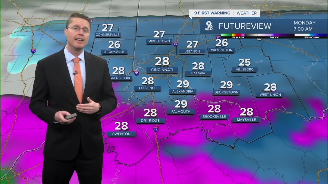 Scattered areas of rain, freezing rain, and snow have started to move into the Tri-State from the west. Before the morning commute, this becomes more widespread, and as temperatures drop into the upper 20s, everything will be freezing rain and snow. Cincinnati and north will see more snow than freezing rain, but areas farther south will see more freezing rain with less snow mixed in.