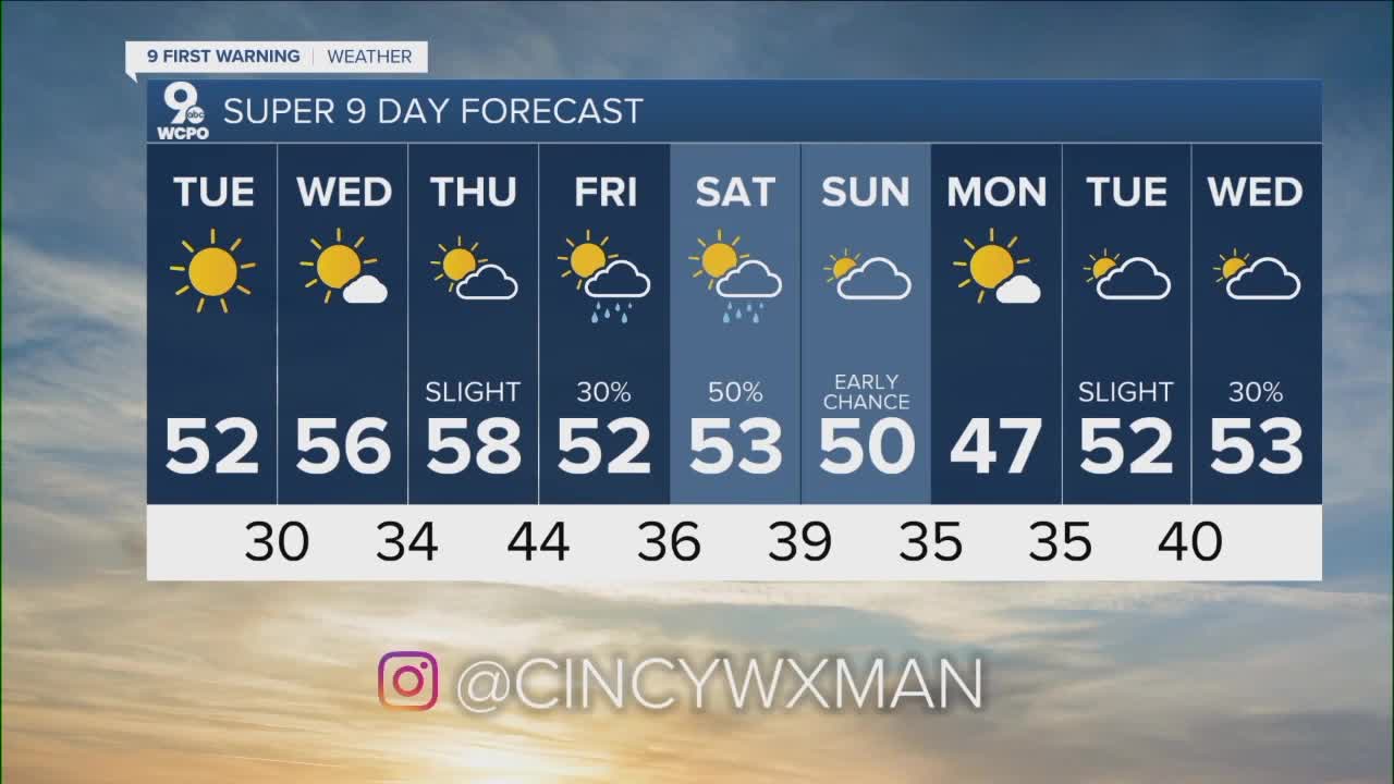 Another more substantial rainmaker looks to head up the Ohio Valley to trigger rain, as soon as, Saturday afternoon and, more likely, in the evening. There's still some chances for showers on Sunday too. Highs fall back to the low 50s.