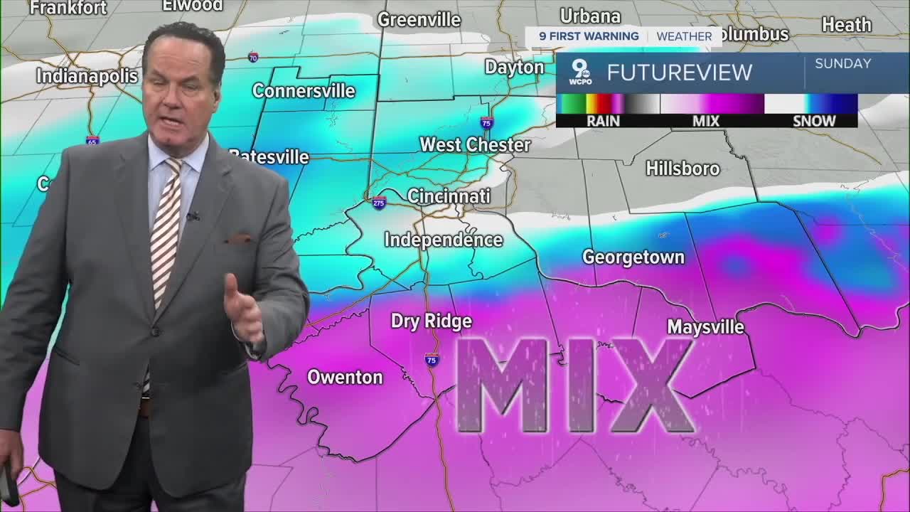 Sunday: Snow continues through much of the day, but there’s an increasing **possibility of a wintry mix (sleet and freezing rain) developing later Sunday as slightly warmer air aloft moves in. If this occurs, it could cut down overall snow totals where sleet/freezing rain is present, especially closer to the Ohio River and through Northern Kentucky.