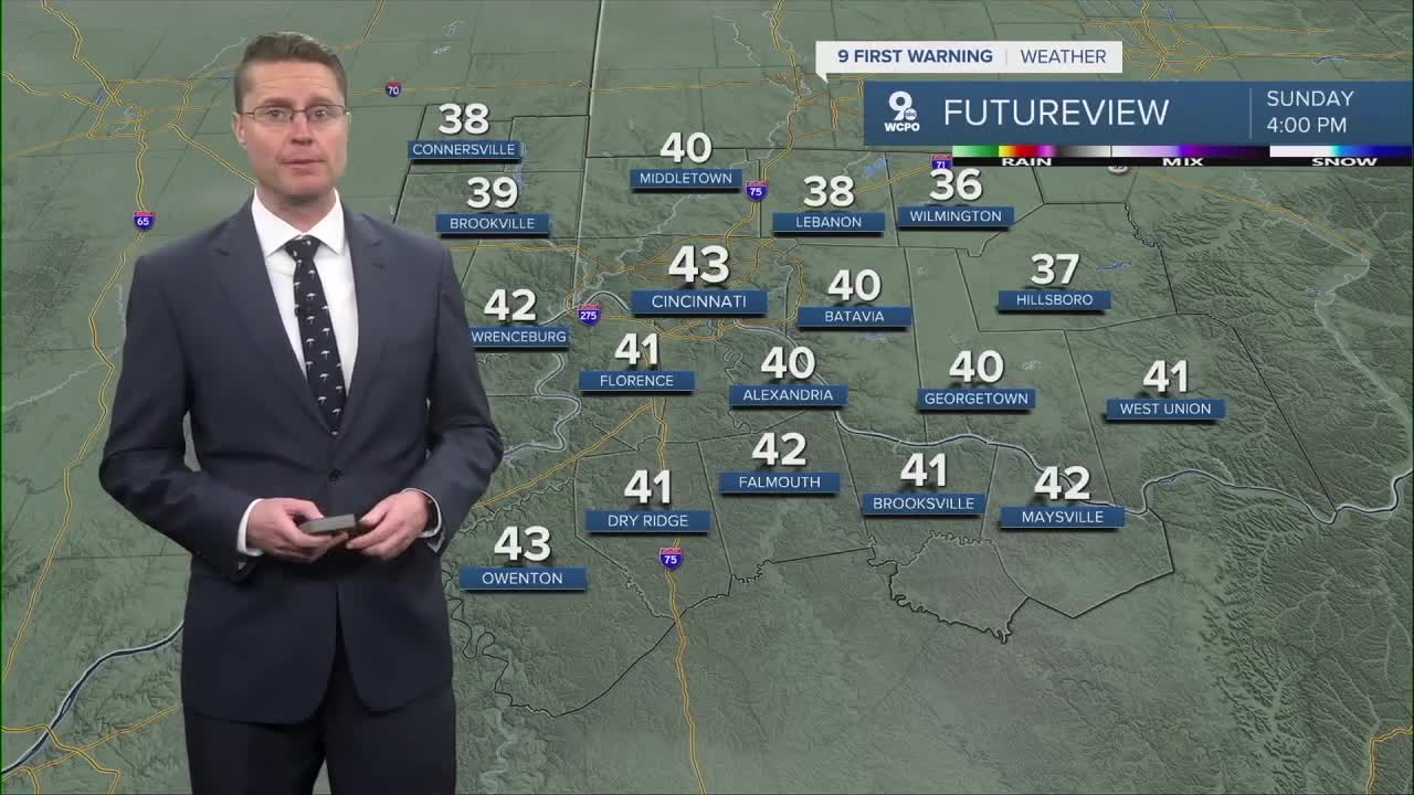Sunday starts with a lot of clouds, but we should see at least some sunshine in the second half of the day. It will be a lot colder behind the cold front with highs in the low 40s. That's about 20 degrees colder than Saturday.