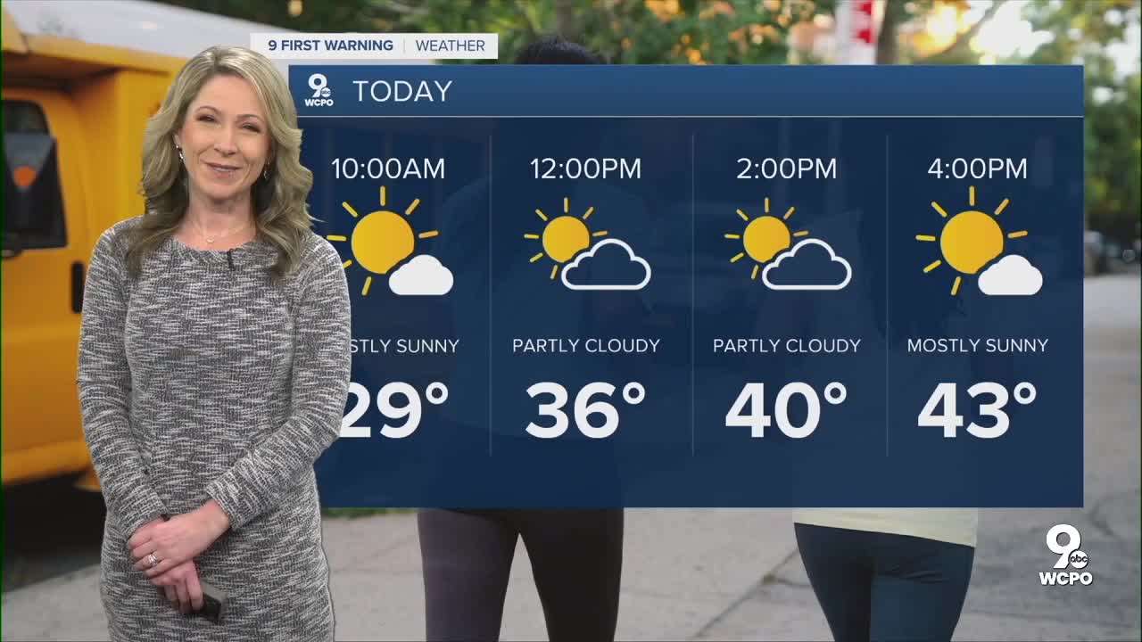 Temperatures aren't as cold this morning as we start out in the mid 20s. The sky is clear and winds are coming in from the southwest at 10 mph, so there is a bit of a wind chill to factor in. The sky will be mostly sunny throughout the day as temperatures increase to 43 degrees.