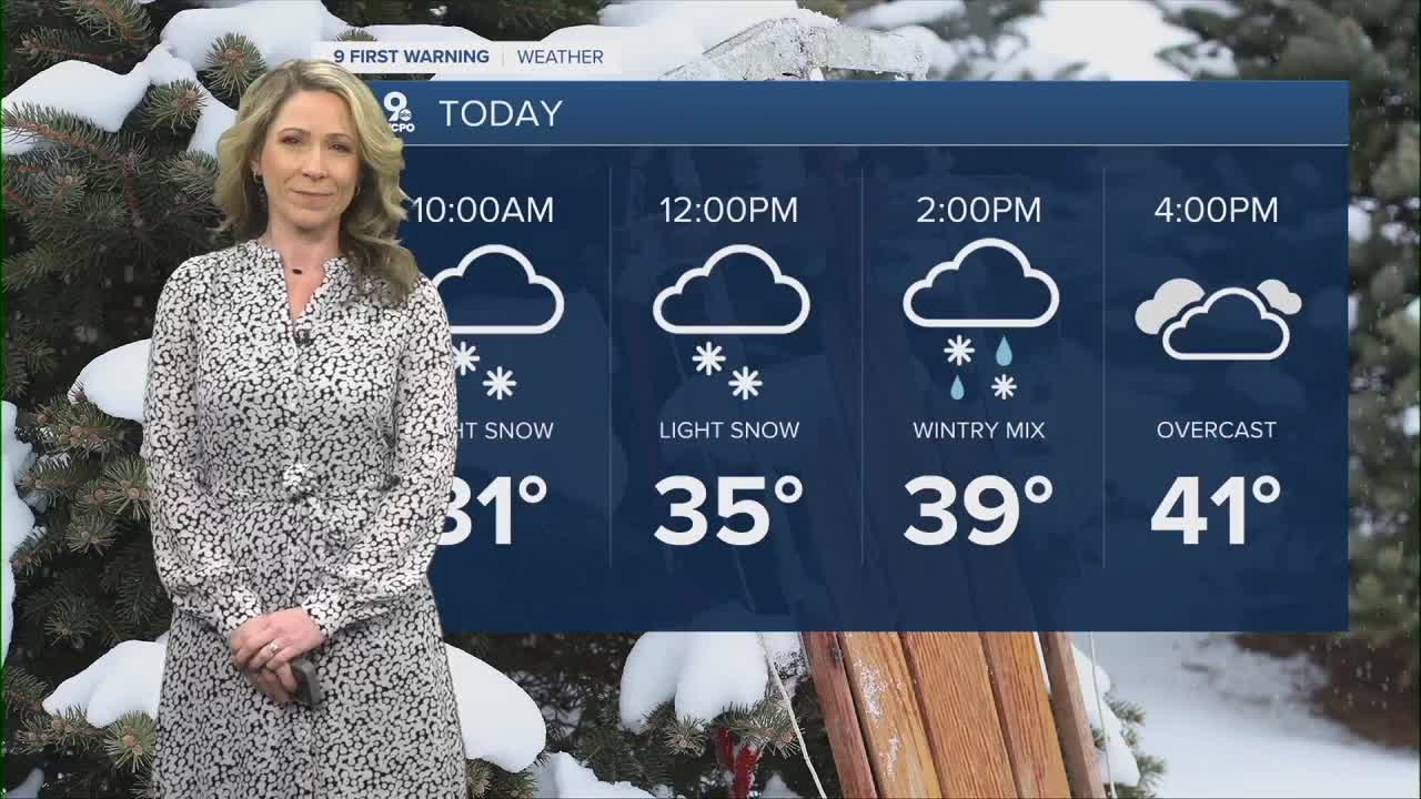 For our Wednesday forecast, we could see some slick spots developing on the roads as a quick-moving clipper system passes through the Ohio Valley. Light snow will begin between 6 to 8 a.m. and then turn more widespread leading into the noon hour. This will be enough snow to cover the roads and lead to slick conditions on untreated roads. As temperatures rise, the snow switches over to a wintry mix into the early afternoon hours. Precipitation will wrap up before the peak evening rush. Today's high increases to 41.