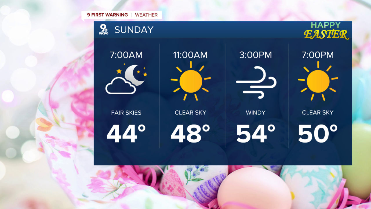 By Easter Sunday, a cold front moves east of us, bringing cooler air with highs dropping into the upper 50s and lingering showers possible in the morning. But, indicators point to clearing just after daybreak.