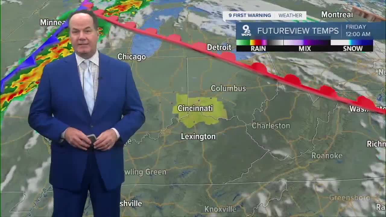 We stay dry for several hours to start the day. While it’s a warm and partly sunny start, there is a 30% chance of showers and thunderstorms by noon. Scattered showers and a chance for storms will likely develop ahead of a cold front moving through the evening. Rain and storms will start after noon in SE Indiana and stretch across Greater Cincinnati about 3-5pm.