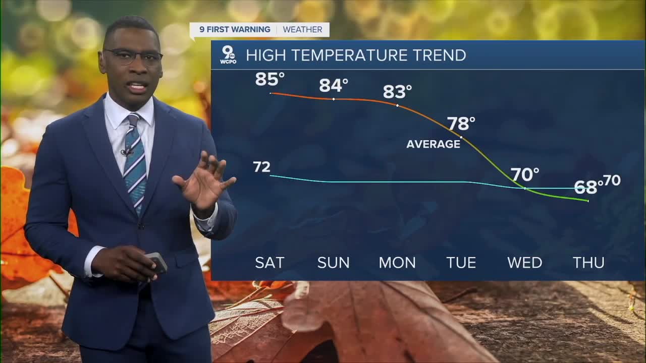 Saturday kicks off in the upper 50s, but with plenty of sunshine, we’ll warm quickly into the mid-80s. A perfect setup for the UC Bearcats game, with sunny skies and summer-like temps.