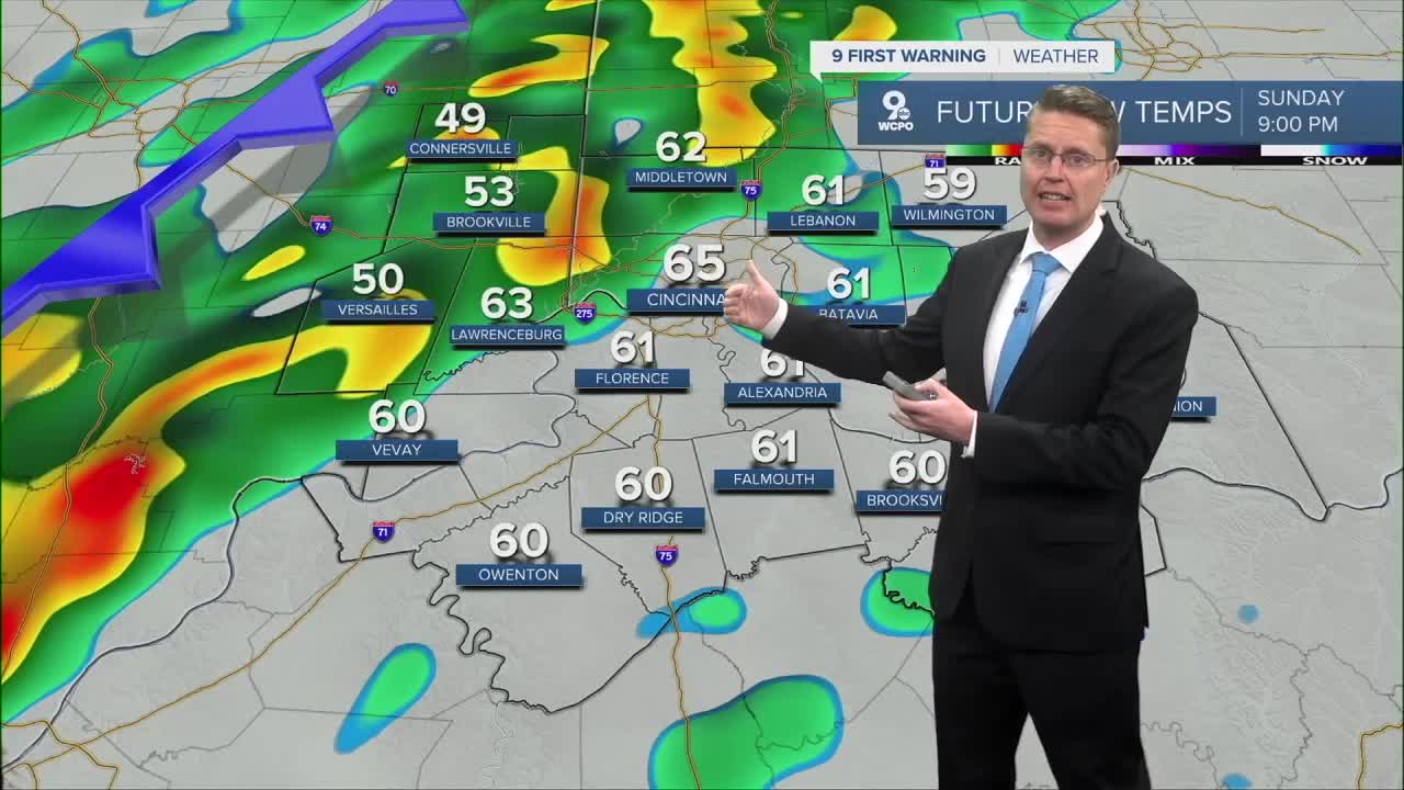 A cold front arrives late Sunday night, bringing a much better chance for widespread showers and a few storms. The heavier rain will start to push into southeast Indiana around 8, but it may not get into Greater Cincinnati until after 9 at night. Any storms will be weakening as they push east, but an isolated severe storm can't be ruled out with some strong wind. It's best to secure any Christmas decorations before the rain arrives.