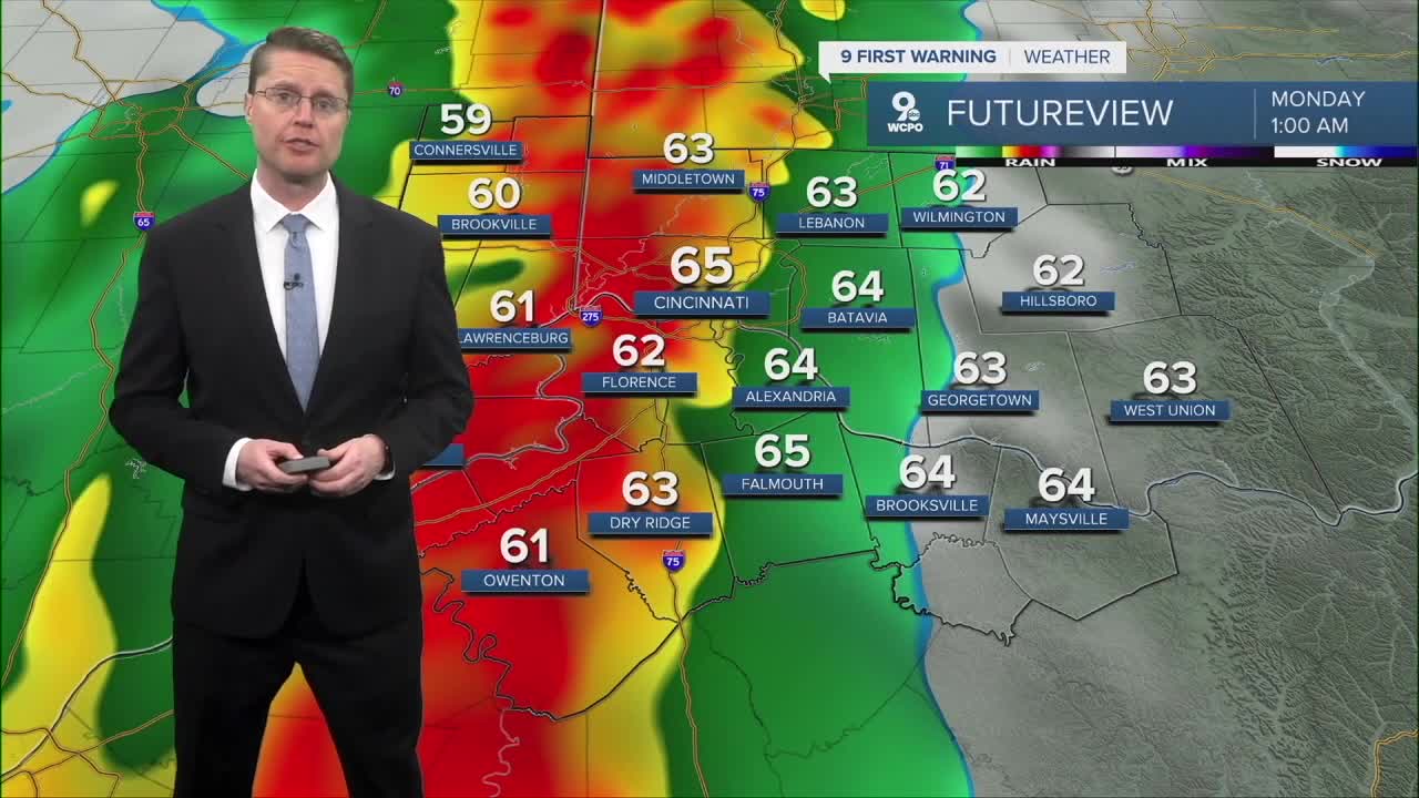 A strong cold front arrives late Sunday night with a line of showers and storms. The storms will be weakening as they push in from the west, but there could be just enough instability to keep them going here. Due to the severe storm threat, we have issued a 9 First Warning Weather Alert Day. If the storms hold their strength, damaging wind will be our main concern, but a couple weaker tornadoes will also be possible in the Tri-State.