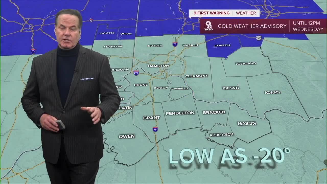 We continue on this stretch of very cold winter weather, with the most intense conditions arriving early Wednesday morning. Temperatures are expected to drop below zero, and when wind is added in, it may feel closer to 20 degrees below zero in some areas. That's why we have a COLD WEATHER ADVISORY out for the Tri-State. Plus, we could see flurries through the early evening.