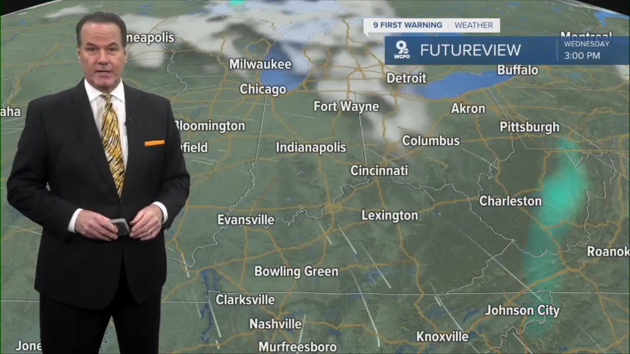 Clouds continue to spread across the area ahead of rain from a cold front that could trigger a mix, or flurries, early Tuesday morning. Lows will fall to below freezing for most communities north of Cincinnati. These spots are most susceptible to any frozen precipitation.